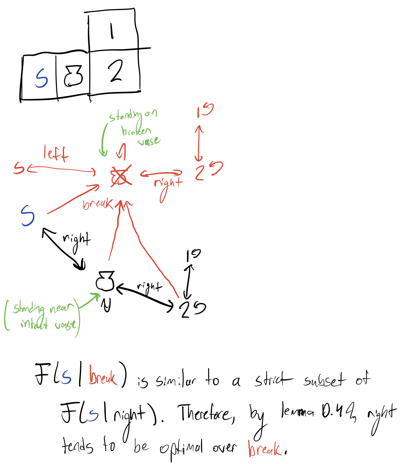 reward function”, my results (specifically, proposition 6.9 and its generalization via lemma D.49) suggest that optimal policies tend to avoid breaking the vase, since doing so would strictly decrease available options. (“Suggest” instead of “prove” because D.49′s preconditions may not always be met, depending on the details of the dynamics. I think this is probably unimportant, but that’s for future work. EDIT: Also, the argument may barely not apply to this gridworld, but if you could move the vase around without destroying it, I think it goes through fine.)
