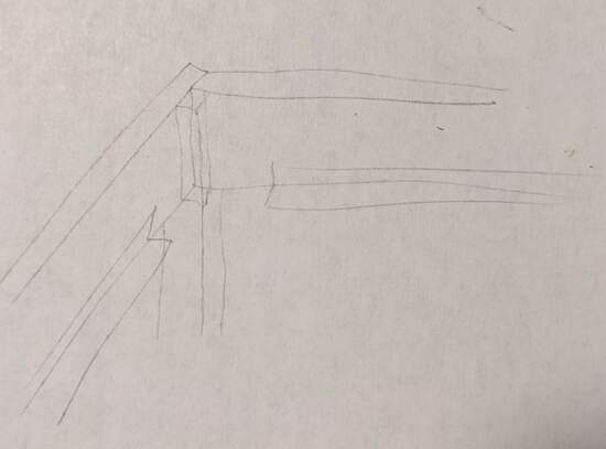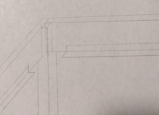 Once I’m happy I start over with a ruler and a pencil. At this stage you can make it a scale diagram if you want by picking a ratio between real-life distances and on-page distances, like 1′ = 1/2″. For lines coming out of the page you can keep the same ratio, or use a smaller one like 1′ = 1/4″. Most of the time I just eyeball this and it’s good enough for what I’m doing. I draw any lines that make things easier to see how parts fit together, even ones that would be occluded behind solid things: