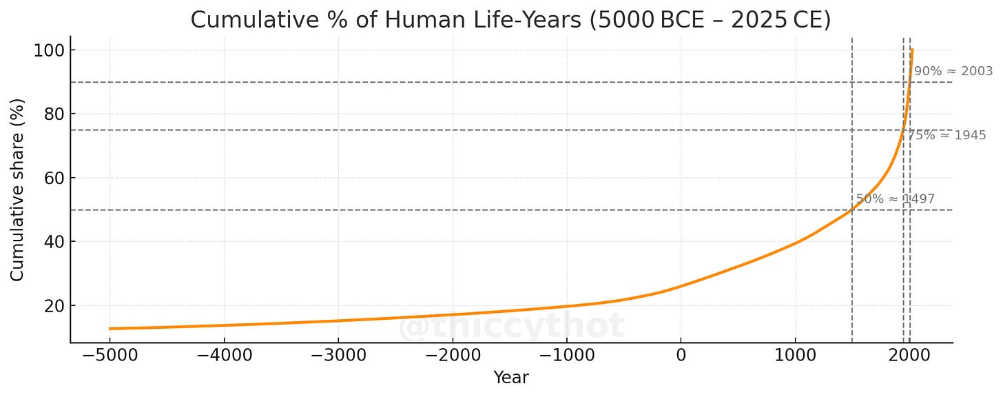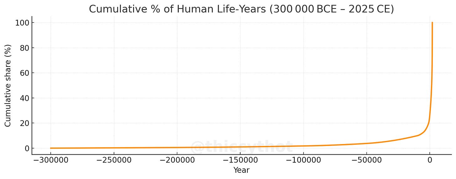 I charted the cumulative total of human life years by anchoring on known population figures from public datasets and linearly interpolated the gaps without introducing any assumptions about average lifespan (code below if you want to tweak the anchors).1