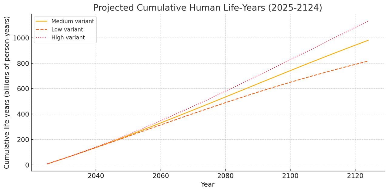 Even as global population is projected to top at ~10 billion 2080 as birthrates from developed nations naturally slow, there is still twenty five percent of all human experience that will be lived over the next 50 years. Every subsequent calendar year accounts for roughly 0.50% of all human experience.