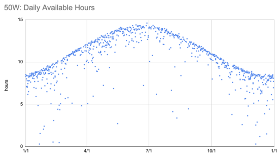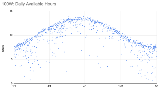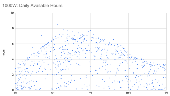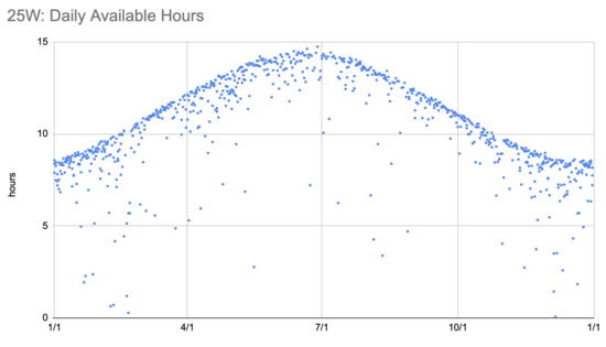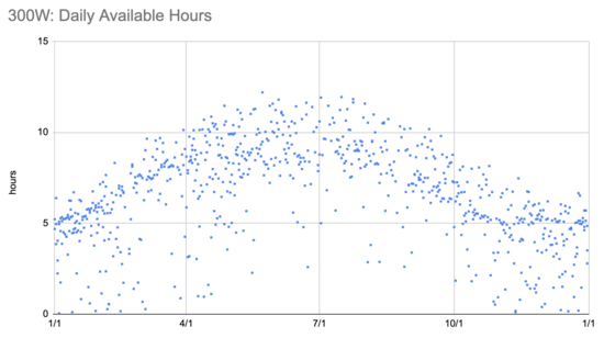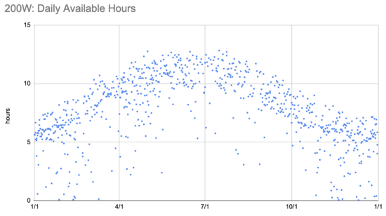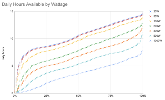 Another way to look at this, though, is about what sort of usage it might support. The SPS produces power on a best-effort basis. If you attempt to draw more than the panels are producing it shuts off and takes a few minutes to reset. Let’s model this: if you want to run some thing that draws some amount of power, for example a sump pump or freezer, how many hours a day would you have enough sunlight to run it?