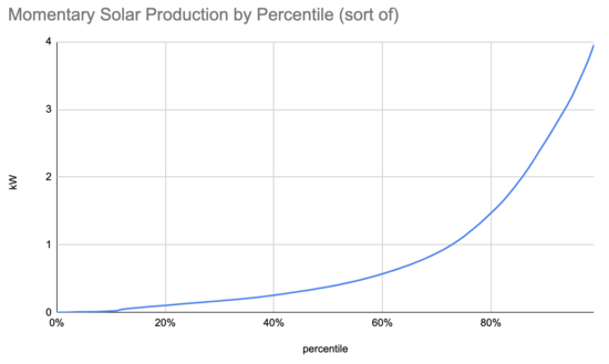This is a mildly tricky chart, because the raw data does not include times when the system is producing no power at all, such as the night. So it is saying, “if the system is producing power, how much power is it producing.”