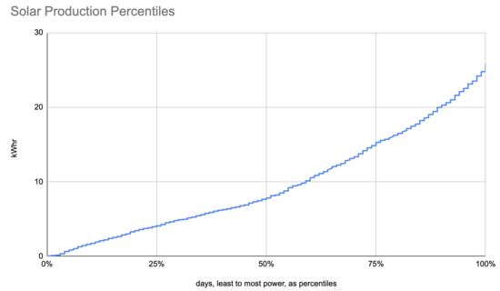 This is the same chart, but instead of aggregating at the “minute” level we are aggregating at the “day” level. You could read this and conclude that a median amount of power is 7.8kW/​day, but sunlight varies a lot over the year, and so does production:
