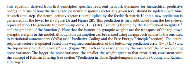 If you are interested in these ideas, it is helpful to understand the mathematical framework that underlies the more grandiose statements. If nothing else, it grounds your thinking, and it potentially gives you a real mathematical playground to test any ideas you might have about predictive coding. Additionally, 1999 was quite a while ago, and in many ways I think the mathematics of predictive coding makes more intuitive sense in today’s deep learning ways of thinking, than in the way originally presented. I’ve tried to port the original work into something that looks more at home in today’s ways of thinking (e.g. the code on github i linked to implements a predictive coding network in pytorch and uses convnet structure etc.)