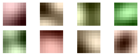 model = PredictiveCodingNetwork(input_size=(3, image_shape[1], image_shape[2]), n_layers=2, n_causes=[8, 10], kernel_size=[[8,8],[3,3]], stride=[4, 2], padding=0, lam=0.1, alpha=0.1, k1=.005, k2=0.05, sigma2=10.)The main ones are that there are 2 layers, with 8 basis causes in the first layer and 10 in the second, and that each cause in the first layer is a kernel of size 8x8 pixels, and each in the second layer is a kernel with size 3x3 (which is no longer in units of pixels but instead of first layer kernels).