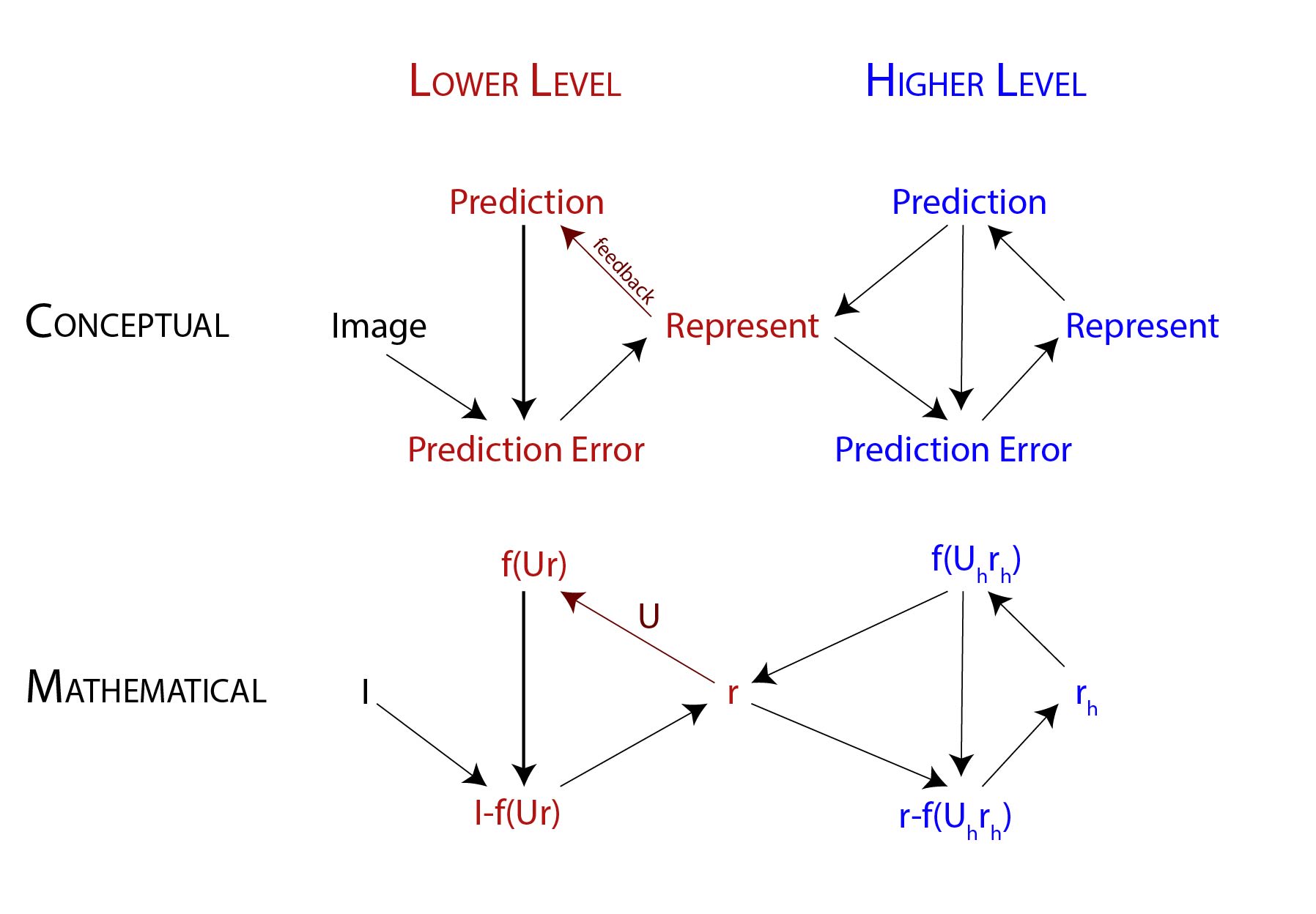 Similarly, , is the error between the current setting of and the prediction of given by the higher-level causes. This is a higher-level prediction error.