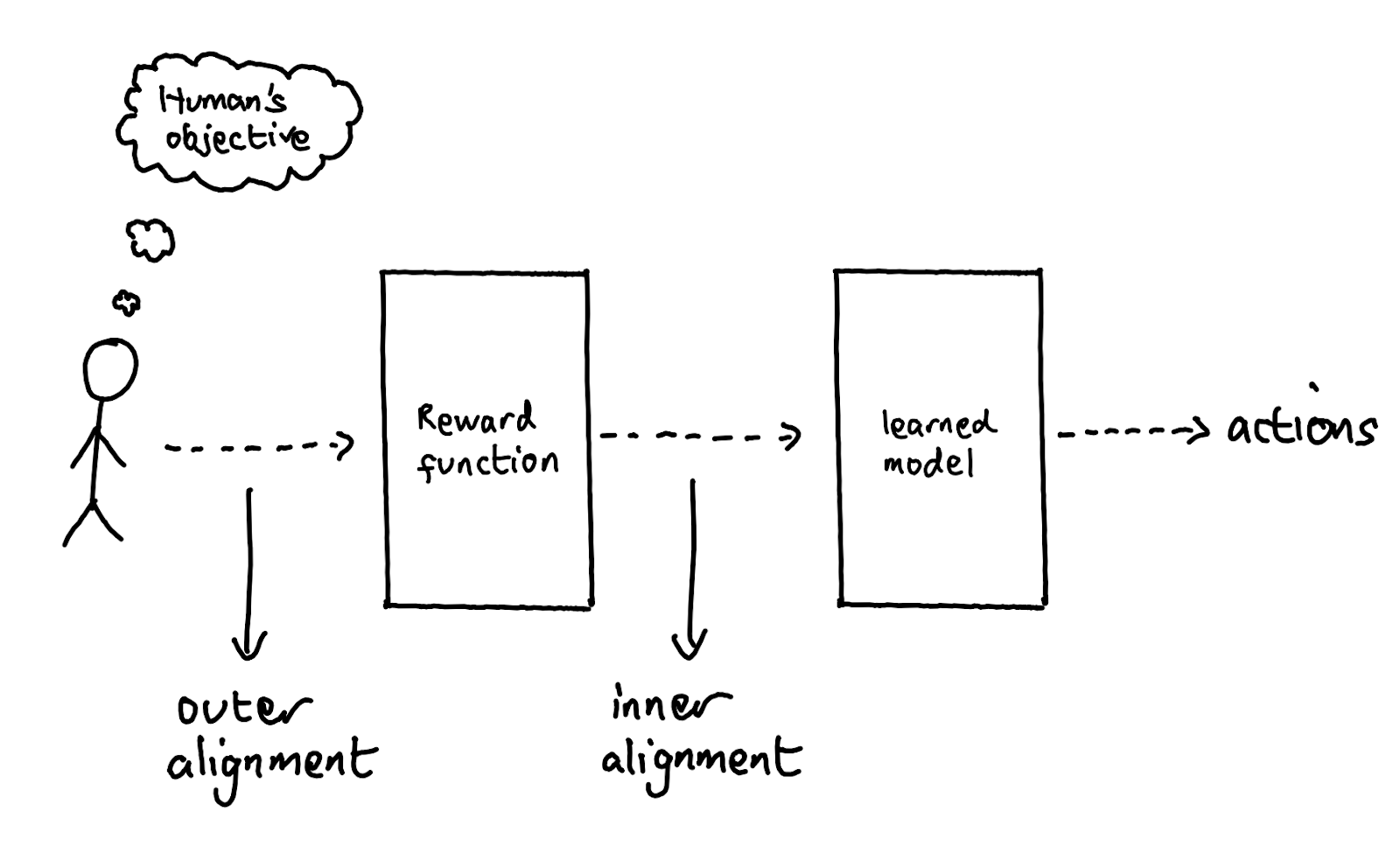 There are two broad families of ways techniques like this can fail. The first is when our reward function fails to fully express the true preferences of the programmer—we refer to this as outer misalignment. The second is when the AI learns a different set of goals than those specified by the reward function, but which conveniently happens to coincide with the reward function during training—this is inner misalignment. We will now discuss each of these in turn.
