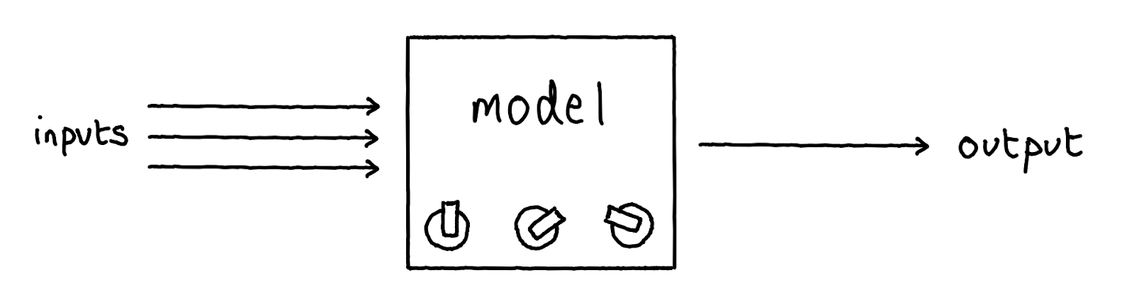 Step 1: you define a statistical model. This takes the form of some equation that has some unknown constants (“parameters”) in it, and some variables where you plug in input values. Together, the parameters and input variables define an output. (The equations in ML can be extremely large, for example with billions of parameters and millions of inputs, but they are very structured and almost stupidly simple.)