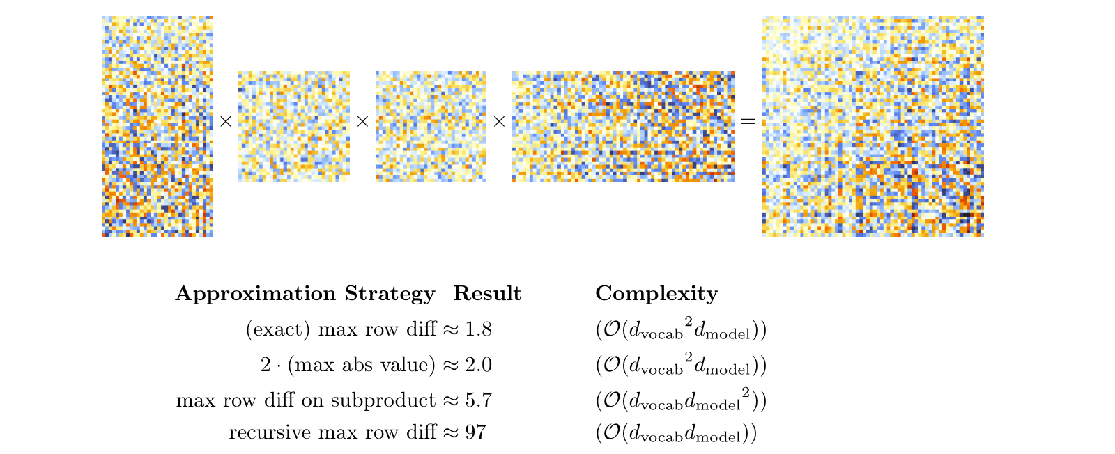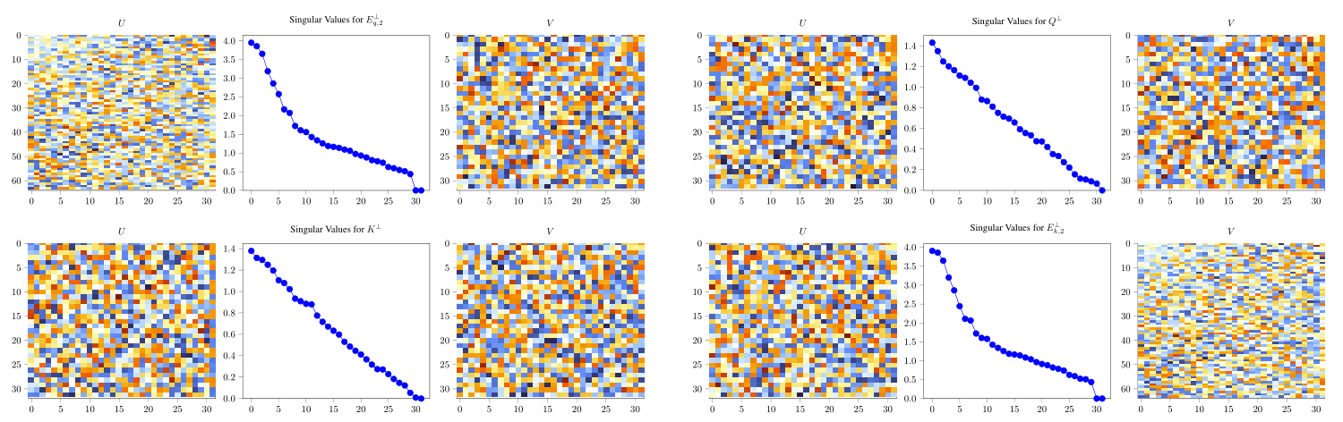 One way to cheaply check this without multiplying out EQKE (which would take time) is to factor out the principal components of each of the component matrices. Although the residuals for each of the four component matrices (after removing the first two principal components) are both small and seem to be noise, proving that there’s no structure that causes the noise to interact constructively when we multiply the matrices and “blow up” is hard.