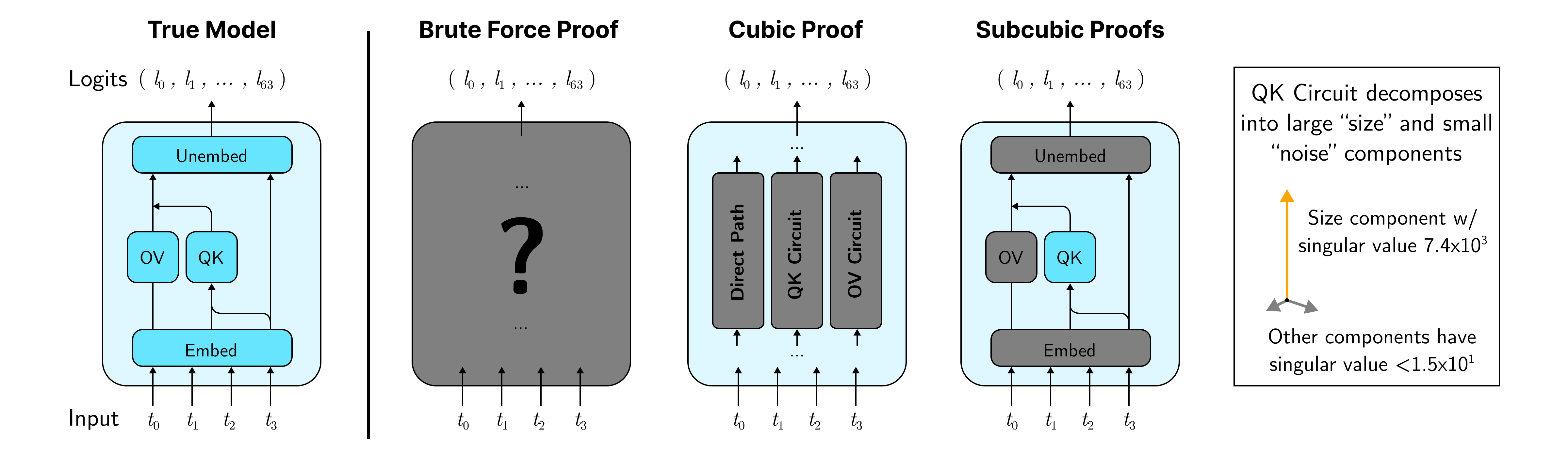 The third class of proof strategies examines each path independently, and groups the inputs for each path by two of the three types of tokens mentioned previously. To get cheaper proxies for model behavior, strategies in this class use knowledge that we might associate with traditional “mech interp”, such as the fact that the QK circuit is approximately rank one, with the principal component measuring the size of the key token.
