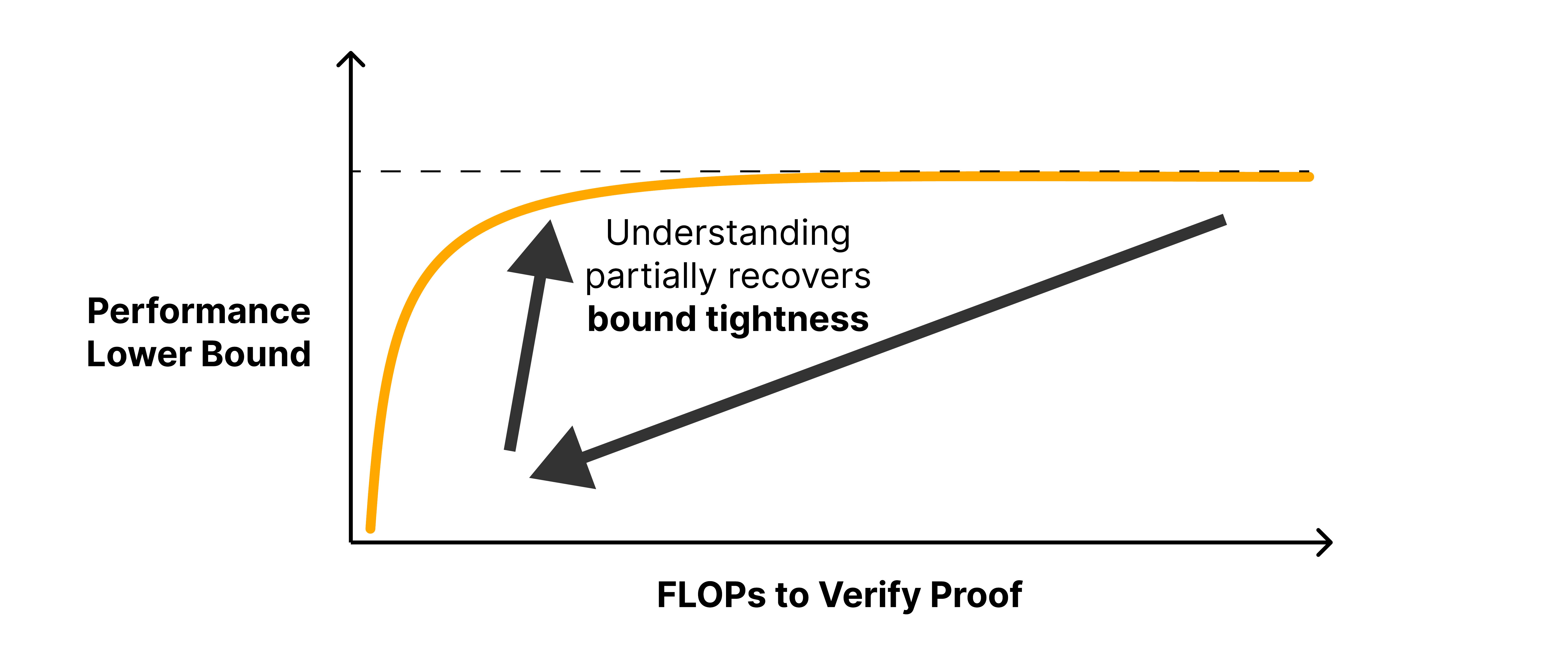 Performance Lower Bound vs. FLOPs to Verify Proof.  Brute force proof on the upper right, trivial proof on the lower left.  An arrow from upper right to lower left labeled decreased length of proof leads to looser bounds.