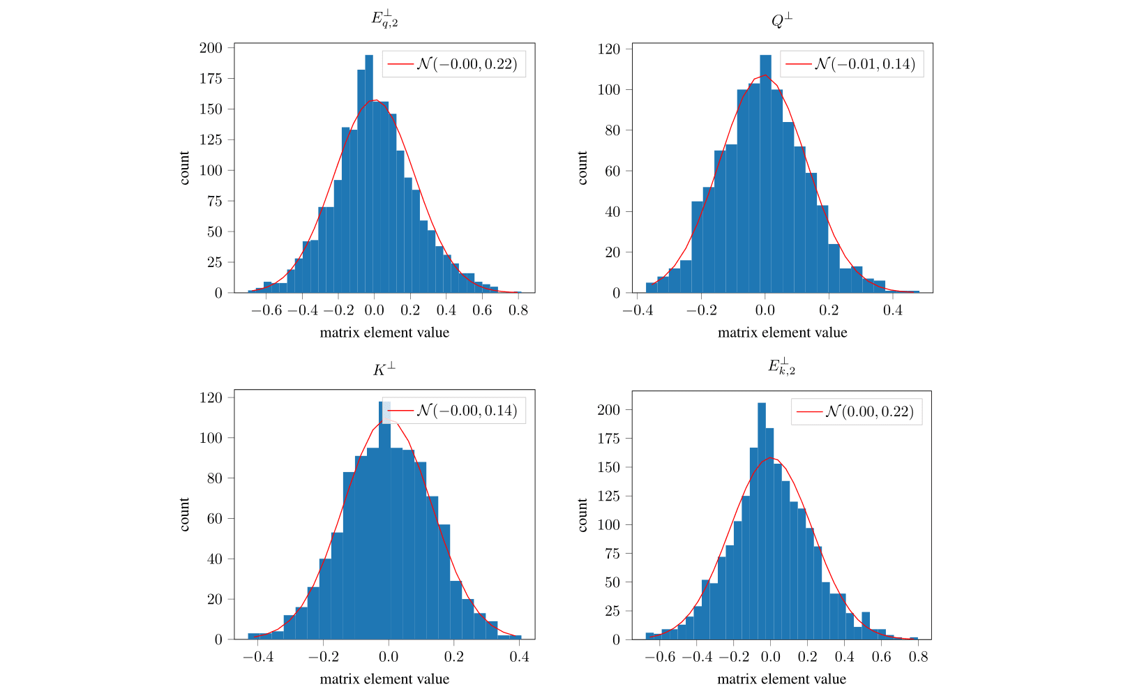 The entries of the four component matrices are distributed roughly normally.