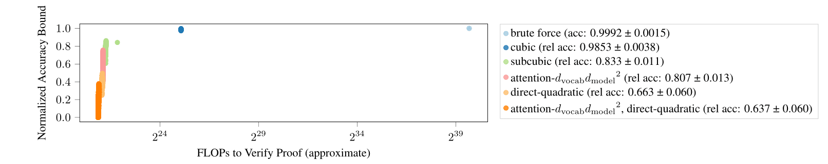 Table 1: We report the proof complexity, normalized accuracy bound, and estimated flops required (Equation 2), as well as unexplained dimensonality (Section 5). We round the FLOP and unexplained dimension counts to the closest power of 2, and report the mean/​standard deviation of the bound averaged across all 151 models. As we include more aspects of the mechanistic interpretation (reflected by a lower number of unexplained dimensions), we get more compact proofs (in terms of both asymptotic complexity and FLOPs), albeit with worse bounds. For space reasons, we use , , and .