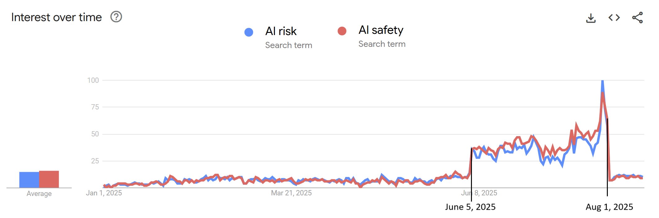 Google Trends interest in the search terms “AI risk” and “AI safety” sharpy increased on June 5th and remained high through August 1st before sharply returning to the previous trend of steady growth on August 2nd.