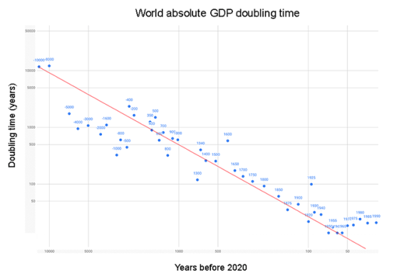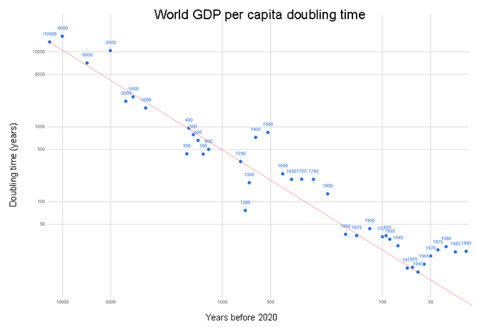 The vertical axis is the amount of time it took the world economy to double from that year, according to this paper. So for example, if at some point the economy doubled every twenty years, the dot for that point is at twenty. The doubling time decreases throughout most of the period being examined, indicating hyperbolic growth.