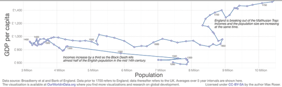 It looks like through the 1350 – 1450 period, population keeps declining, and per capita income keeps going up, as Malthusian theory would predict.