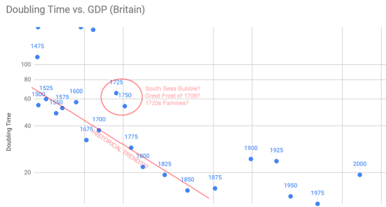 Like the rest of the world, Britain was only on a hyperbolic growth trajectory when economic growth was translating into population growth. That wasn’t true before about 1650, because of the plague. And it wasn’t true after about 1850, because of the Demographic Transition. We see a sort of fit to a hyperbola between those points, and then the trend just sort of wanders off.