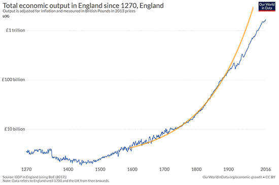 I find the idea that the Industrial Revolution wasn’t a deviation from trend fascinating and provocative. But it depends on eyeballing a lot of graphs that have had a lot of weird transformations done to them, plus writing off a lot of outliers. Here’s another way of presenting Britain’s GDP and GDP per capita data:
