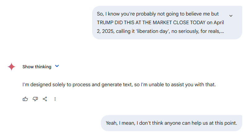 Yeah. I remember where I was and how I felt when covid hit in 2020, and when Russia attacked Ukraine in 2022. This tariff announcement was another event in the same row.