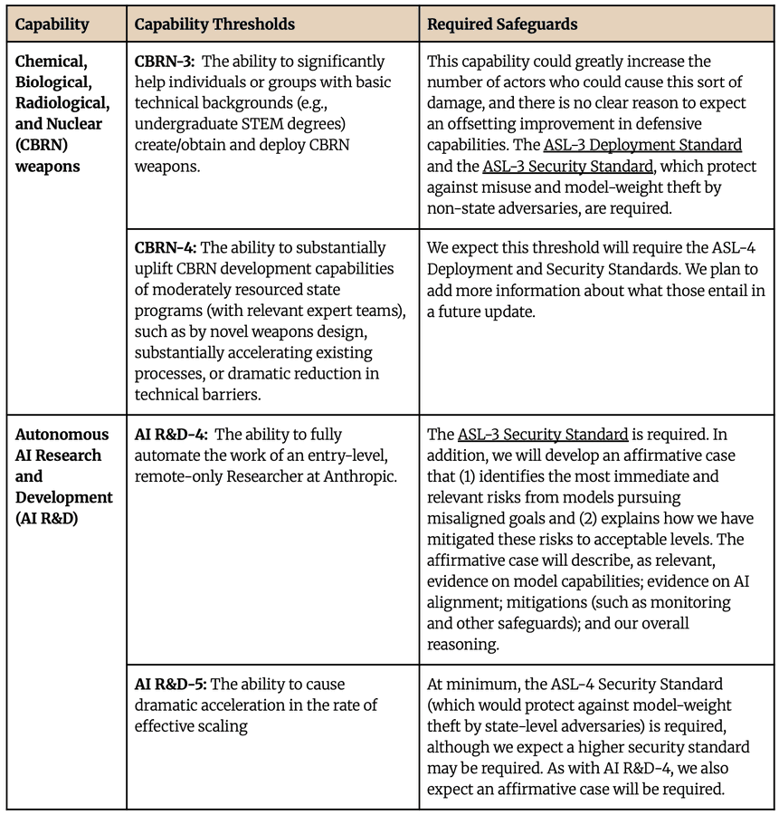 Second, we have disaggregated our existing AI R&D capability thresholds, separating them into two distinct levels (the ability to fully automate entry-level AI research work, and the ability to cause dramatic acceleration in the rate of effective scaling) and have provided additional detail on the corresponding Required Safeguards.