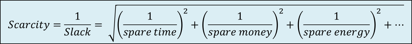 It would seem that the term “scarcity” is being used here in something other than its usual meaning (or, I should say, any of its usual meanings—whether colloquial or well-known technical). However, unless I missed it, the term is not defined (except in the formula, which merely says that it’s equal to 1 divided by “slack”… but that doesn’t make the matter any less murky). What is the meaning of “scarcity” in this context?