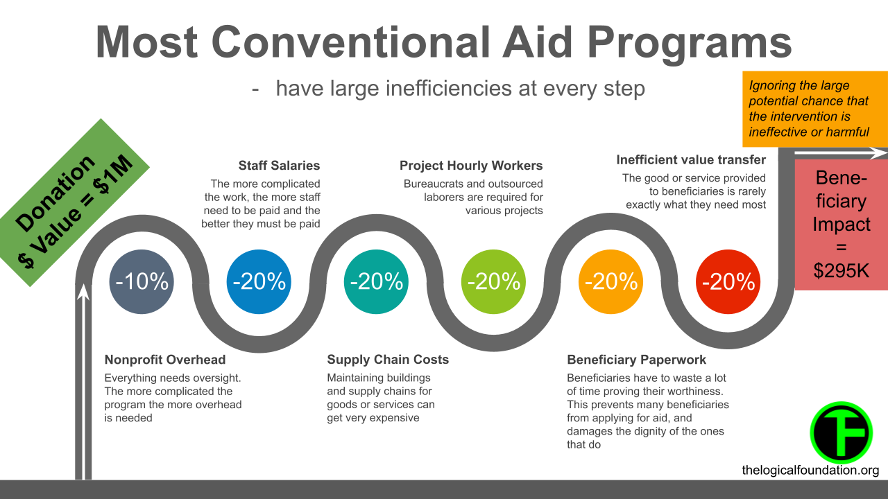 Unfortunately, it’s expensive to provide goods and services. Paperwork is usually an undignified hassle, and beneficiaries rarely get exactly what they need most in developed nations. Oh, and many interventions are ineffective or actively harmful.