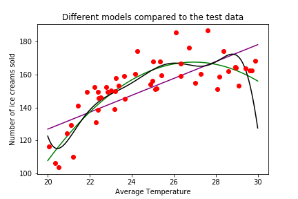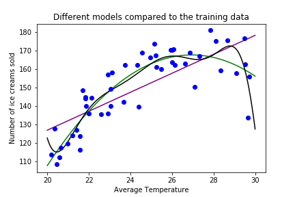 Note that for the training loss we’re using the original data points to test the performance of our model. This makes the training loss easy to calculate and easy to minimize within the class (the set of all polynomials of degree at most ). Here is a plot of some of the polynomials of a fixed degree that minimize the training loss. The purple polynomial has degree 1, the green polynomial has degree 2 and the black polynomial has degree 15.