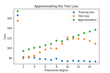 Below is a plot of the training loss, test loss and the approximation of the test loss from our example for different values of . While the approximation isn’t always exact it follows the general trend of the test loss. Most importantly, both the test loss and the estimation have a minimum at . This shows that using approximation would let us select the best model which in this case is a quadratic.