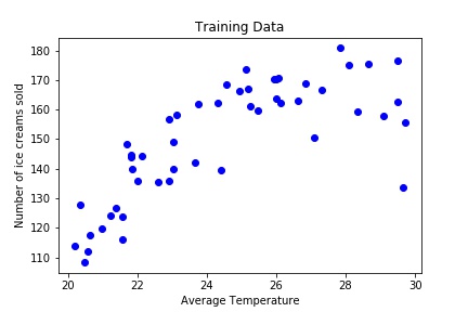 For polynomial regression, our data is in the form of pairs of real numbers. Our goal is to find the relationship between the input values and the output values and then use this to predict future outputs given new inputs. For example, the input values could represent the average temperature of a particular day and the corresponding output value could be the number of ice creams sold that day. Going with this example, we can suppose our data looks something like this: