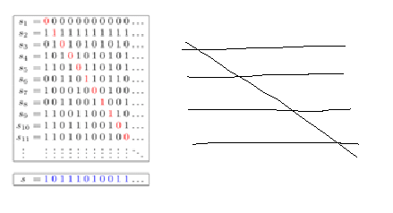 OK, now that that’s settled, what about other proof methods? IMO the obvious next answer is diagonalization. The classic example of this technique is Cantor’s diagonal proof that . The usual visualization suggests a shape: infinitely many parallel horizontal lines stretching off to the right, with a diagonal slicing through them. Unfortunately, my doodle just doesn’t match the kinaesthetic sense I get from diagonalization, the sense of iterating through a list of lists, grabbing the nth item, flipping it and appending. And the lines don’t map to concepts.