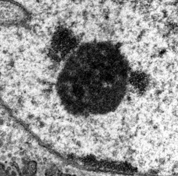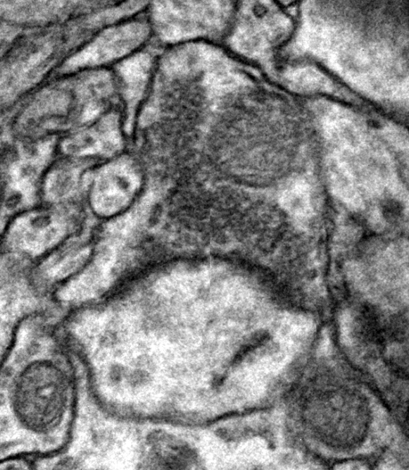 It’s in the same orientation as the model synapse at the start, with the active zone on the bottom and a mitochondria in the upper right. Those individual dark dots in the synapse are each a vesicle (they’re the white spheres in the 3D model), and they each still have neurotransmitter in them. This synapse had probably two million proteins in it before preservation. After preservation, almost all of those two million proteins are likely still there.