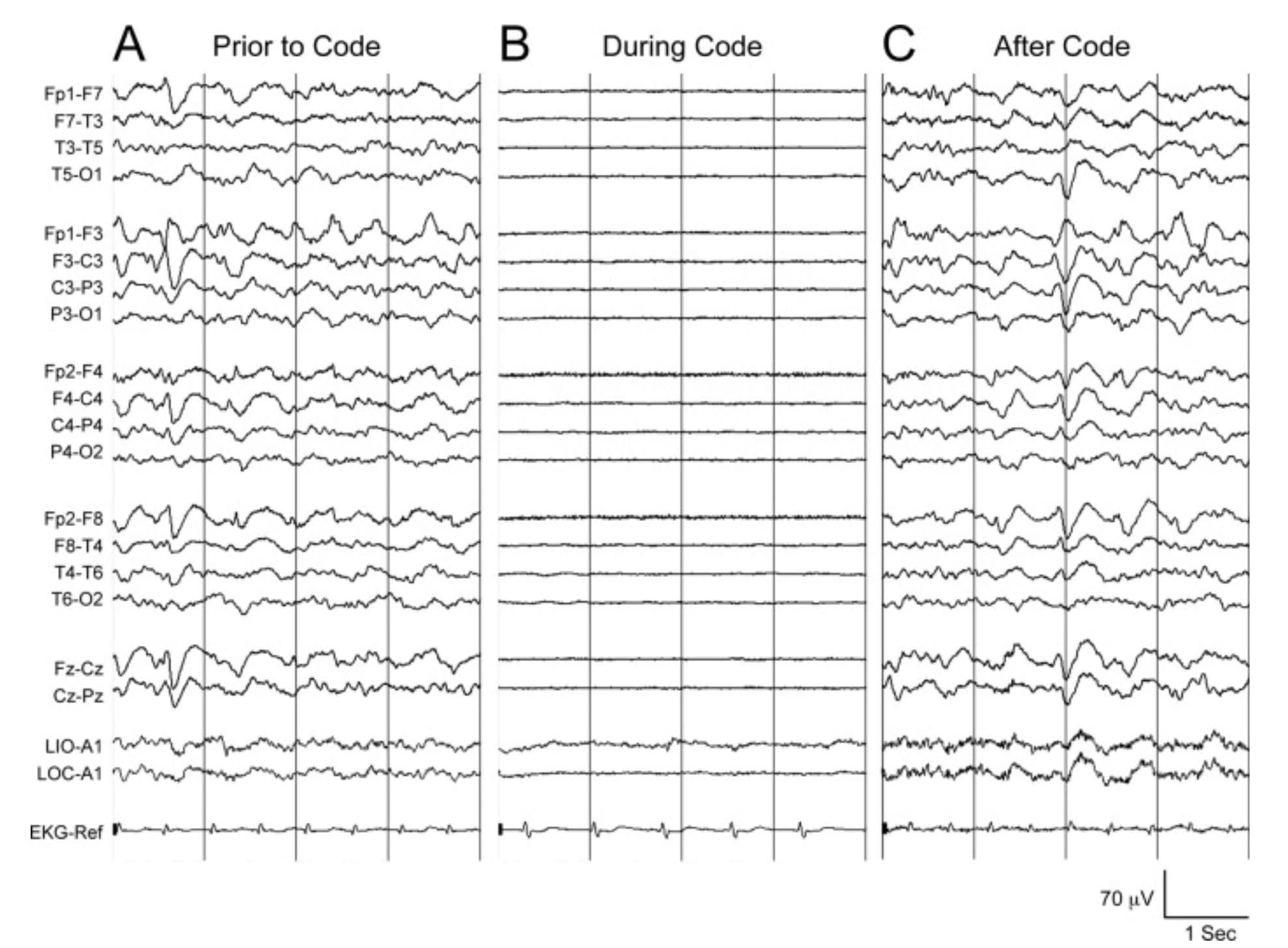 This image, from Broestl et al 2013, is an EEG of a patient’s brain activity. The flat section in the middle is during 15 minutes of cardiac arrest. The patient fully recovered afterwards.