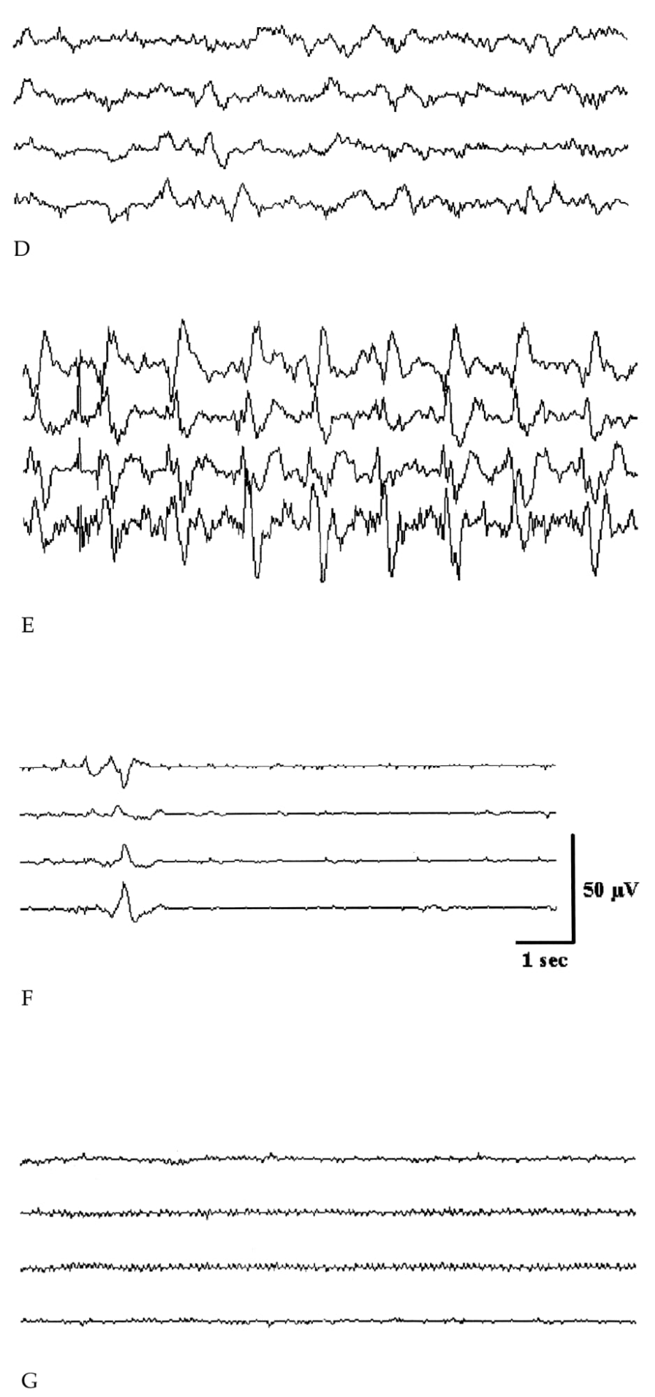 Stecker et al 2001, Part I, Figure 3, “(D) precooling, (E) appearance of periodic complexes, (F) appearance of burst suppression, and (G) electrocerebral silence”. This EEG readout shows the progression of electrical activity in a brain as hypothermia is induced. The final image (G) shows electrocerebral silence—where potential has fallen below the EEG’s level of random noise, around 2–3 µV.