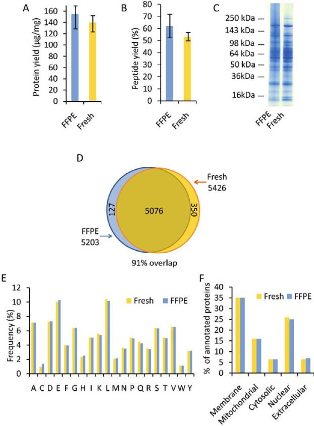 Figure 2. Comparison of FFPE-FASP and FASP (the method used to measure proteins) protocols using FFPE (formaldehyde-fixed and paraffin embedded) and fresh (frozen) tissue samples. Yields of (A) proteins and (B) peptides obtained from FFPE and fresh and samples. Error bars represent standard deviation (n ) 4). (C) Protein extracts from 100 µg wet tissue that was either FFPE treated or fresh were separated by SDS-PAGE and Coomassie stained. (D) Overlap of proteins identified from FFPE and fresh samples. (E) Frequencies of amino acid residues in identified peptides. (F) Subcellular distribution of identified proteins using GeneOntology annotations. From (Ostasiewicz et. al. 2010). Bold parts are my additions for clarity.