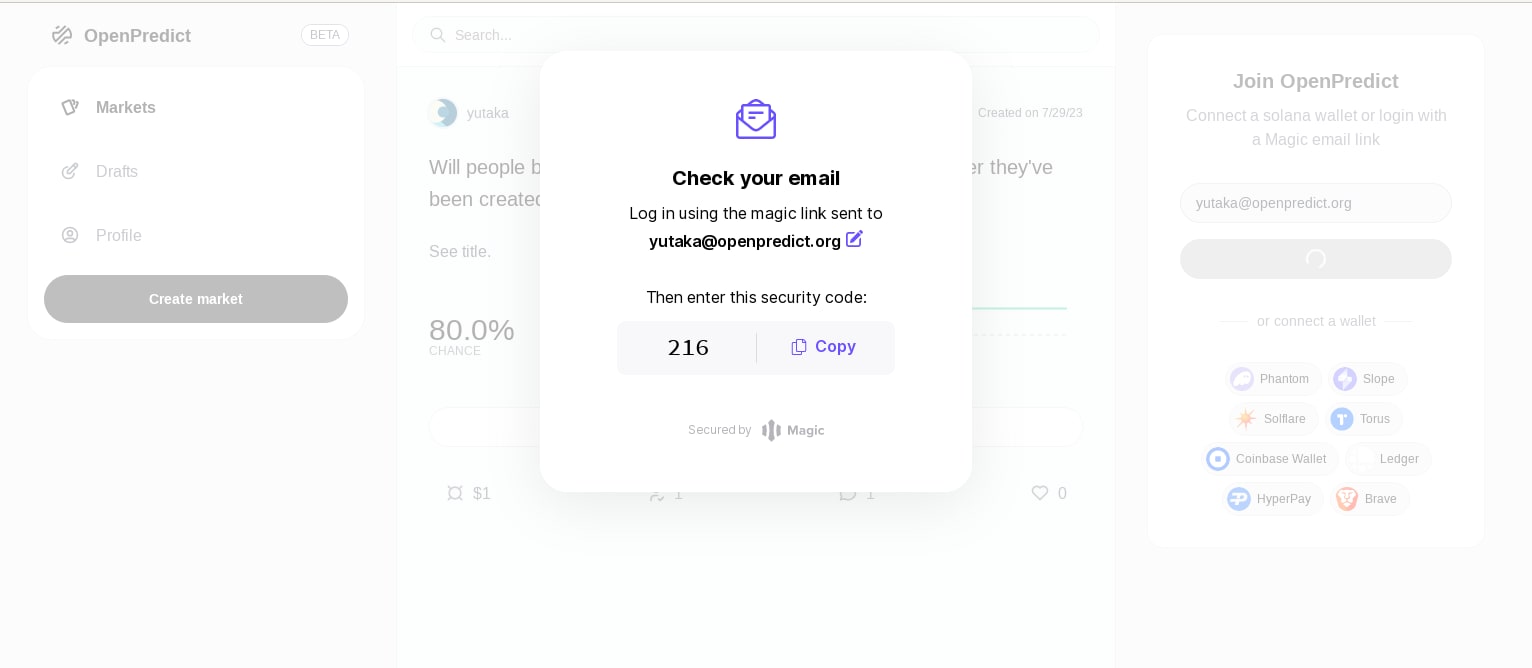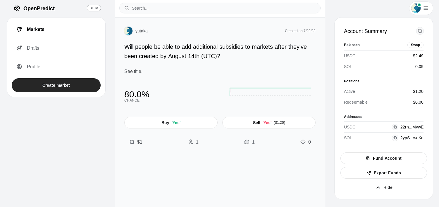 OpenPredict is a toolkit for managing prediction markets which regular people can use for this purpose. We’re calling it a “toolkit” instead of a “website” because OpenPredict’s developers do not act as either arbitrators or market makers; instead, traders set criteria and manage resolution themselves. Likewise, all of OpenPredict’s components, including its web client, are entirely open-source and store important metadata about markets on Solana and IPFS. This means that while you are free to use the public instance at openpredict.org it is an unprivileged, replaceable frontend that you may (and are in fact encouraged to) forgo in favor of a self-hosted client.