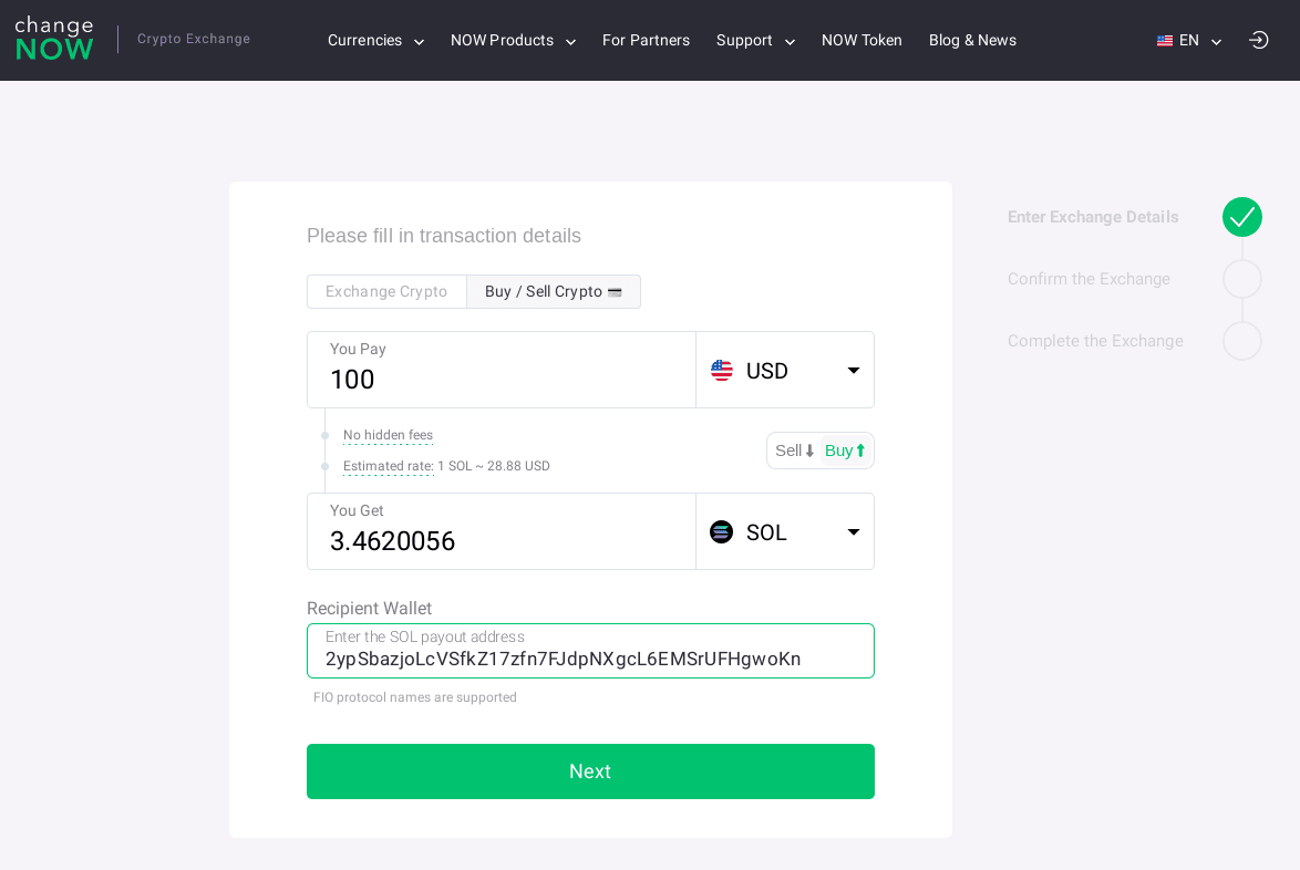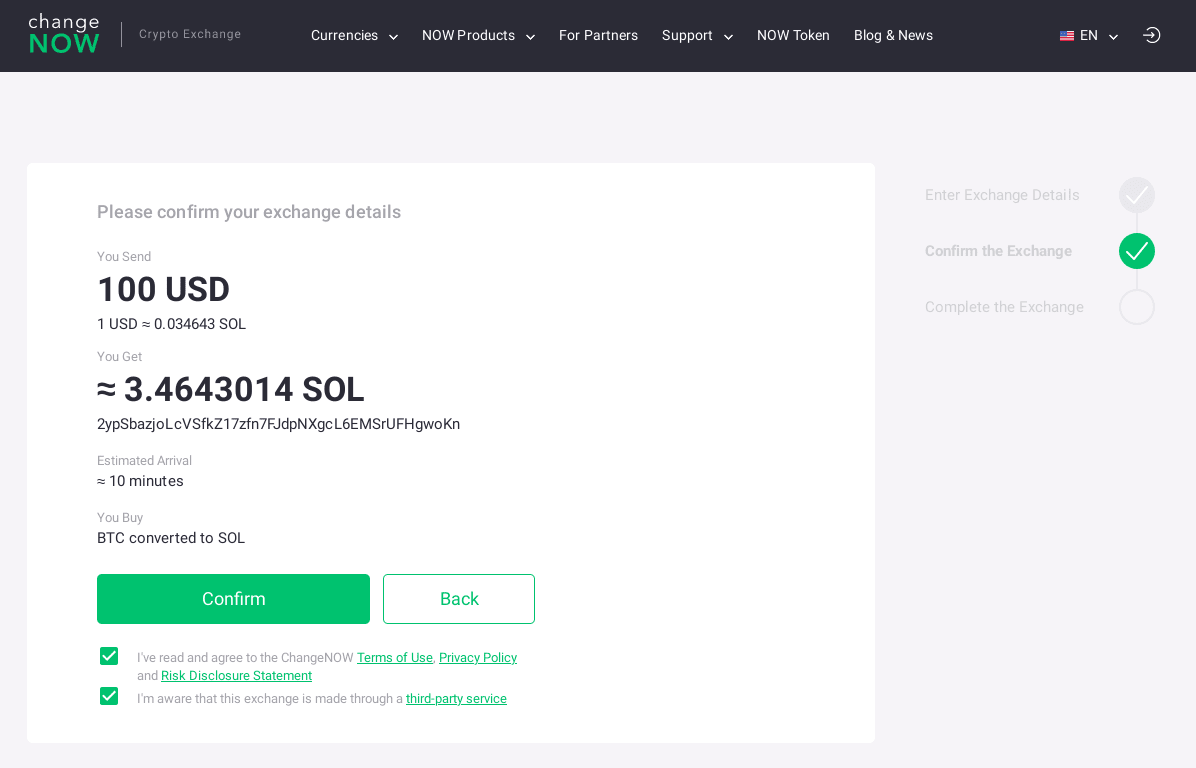 The site will prompt you to buy SOL with normal credit or debit card on changenow.io here. Simply copy your wallet address and put it in the box; Solana transactions confirm in a couple seconds: