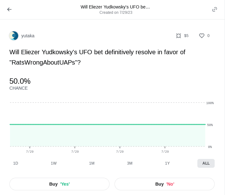The OpenPredict network uses cryptocurrency to settle accounts, but even if you don’t have a crypto wallet, creating a new prediction market on OpenPredict takes less than five minutes. As a tutorial, I’ll be making a market about the outcome of this $150,000 bet between EliezerYudkowsky and the UFO guy. You can view and trade outcomes on the resulting market here.