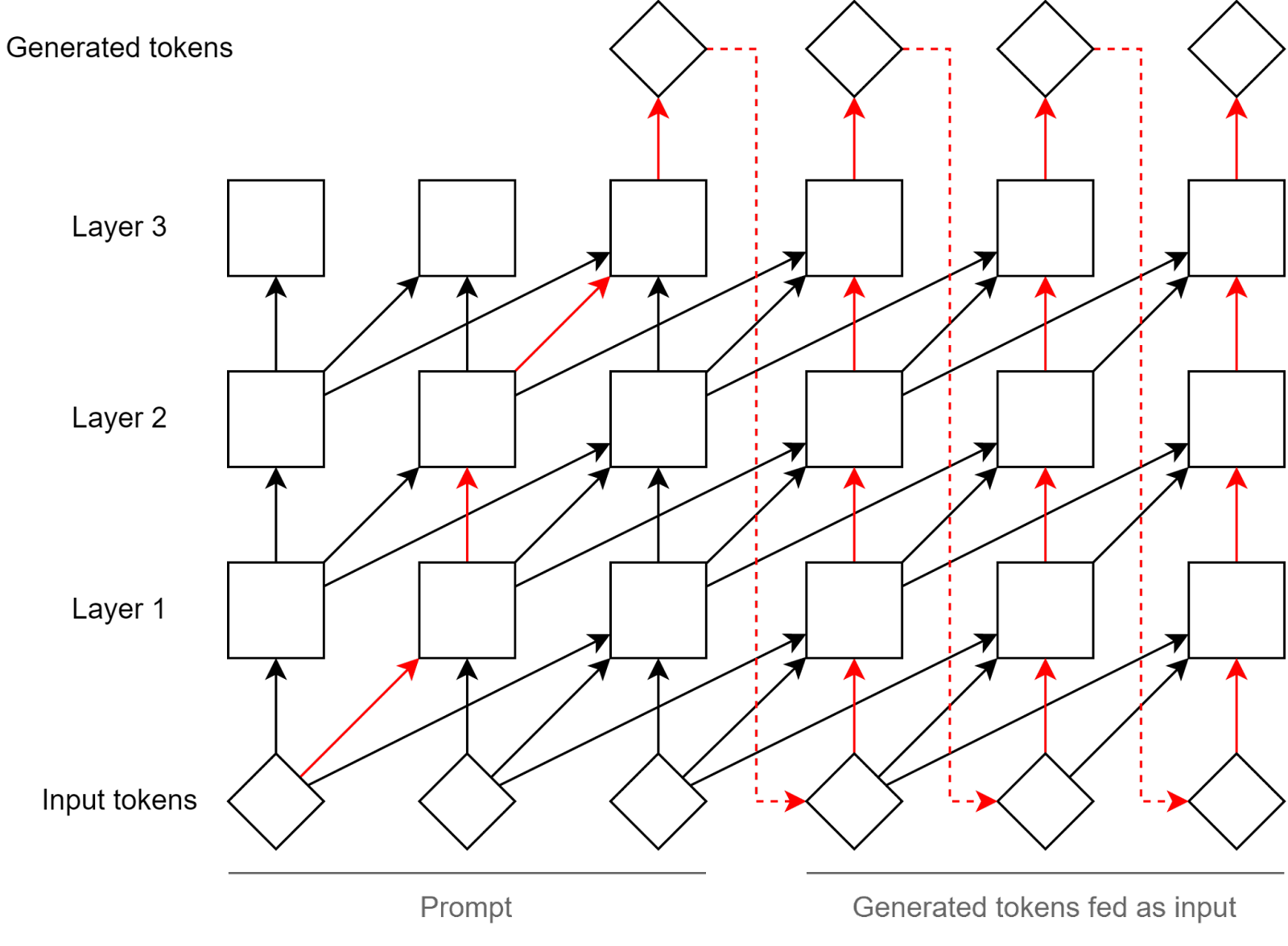 As you can see in the figure below, each path the information can take to generate the first token is exactly long, but paths to generate the last token can be up to long.