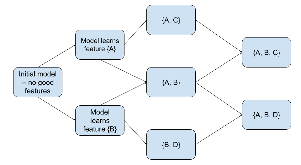 Here, there are two reachable end states, and early interventions can affect which one we end up in. Features C and D are mutually exclusive, and are facilitated by A and B respectively. There might be a grokking-like path from one of the apparent final states to the other, but training is stopped before it occurs.