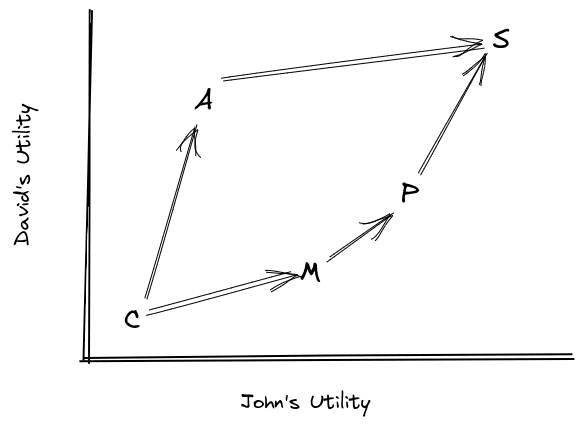 As a concrete example of a system of two subagents with incomplete preference, suppose that John and David have different preferences for pizza toppings, and need to choose one together. We both agree that cheese (C) is the least-preferred default option, and sausage (S) is the best. But in between, John prefers pepperoni > mushroom > anchovy (because John lacks taste), while David prefers anchovy > pepperoni > mushroom (because David is a heathen). Specifically, our utilities are: