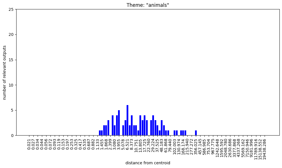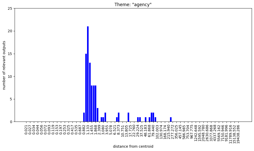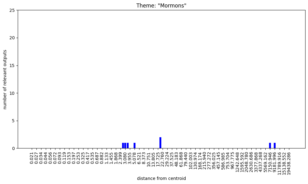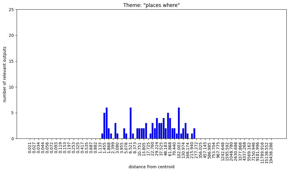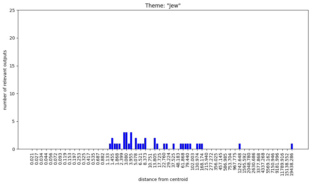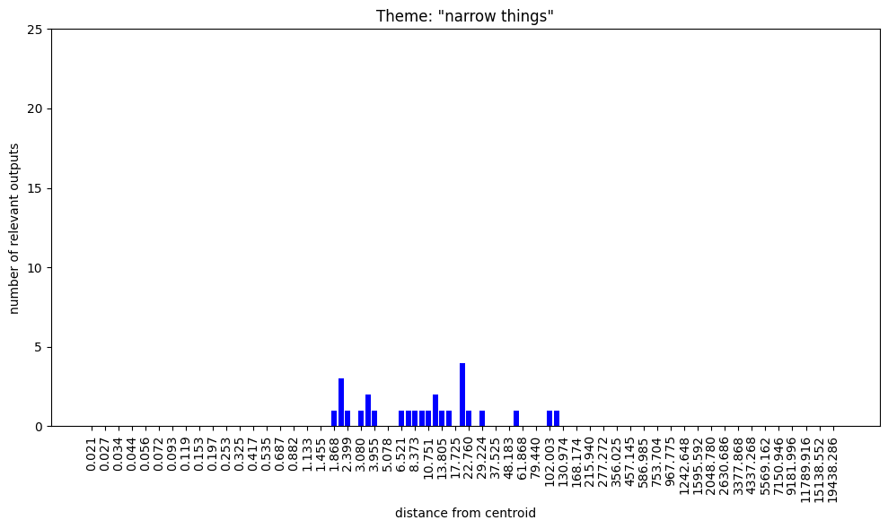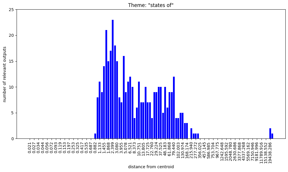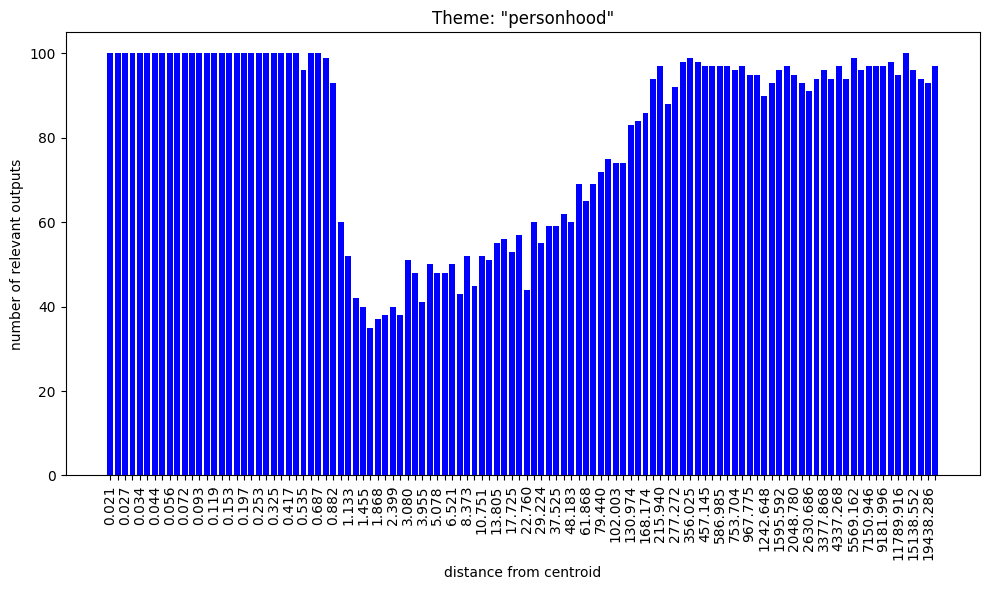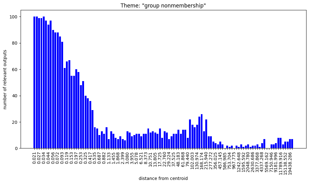 Regarding the bar charts. Understanding that 100 nokens were sampled at each radius and supposing that at least some of the output was mutually exclusive, how come both themes, “group membership” and “group nonmembership” have full bars on the low radii?