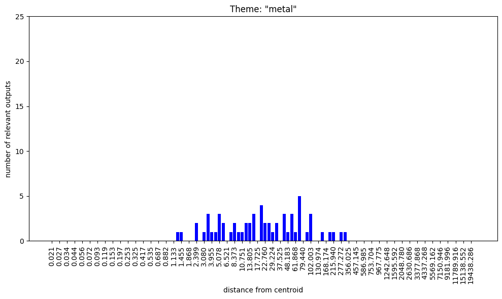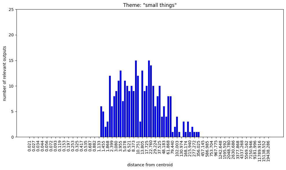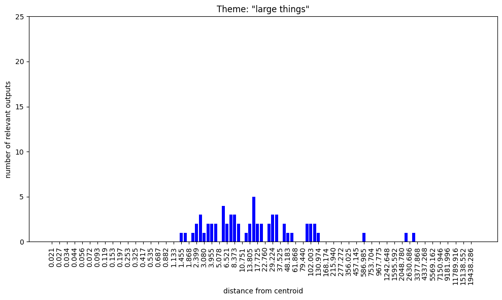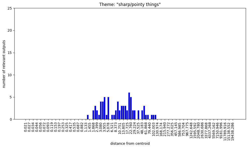 Maybe closer to the centroid, there’s ‘less room’ for complicated taxonomies, so there are just some kinda ‘primitive’ abstractions which don’t have much refinement (perhaps at further distances there are taxonomic refinements of ‘metal’ and ‘sharp’). Then, the nearest conceptual-neighbour of small-magnitude random samples might tend to be one of these relatively ‘primitive’ concepts?