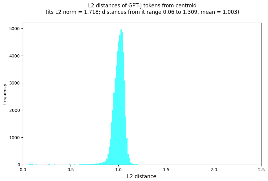 Your concise demonstration immediately convinced me that any Gaussian distributed around a point some distance from the origin in high-dimensional Euclidean space would have the property I observed in the distribution of GPT-J embeddings, i.e. their norms will be normally distributed in a tight band, while their distances-from-centroid will also be normally distributed in a (smaller) tight band. So I can concede that this has nothing to do with where the token embeddings ended up as a result of training GPT-J (as I had imagined) and is instead a general feature of Gaussian distributions in high dimensions.