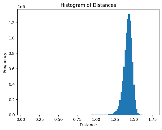3-d spatial thinking stops being useful at this point. Looking at the toroidal cloud above, these min, mean and max values seem at least plausible, but the narrowness of the distribution is not at all: we’d expect to see a much wider distribution of distances. There seems to be a kind of repulsion going on, which the high dimensionality allows for. Also, in 4096-d the intersection of hyperspherical shells won’t have a toroidal topology, but rather something considerably more exotic.