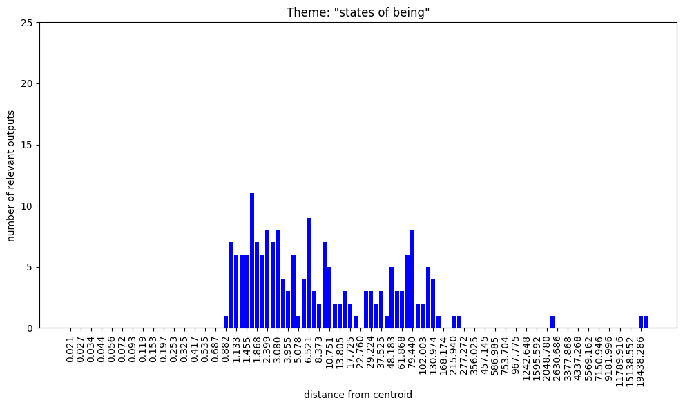 we see very similar results to the last prompt. One noticeable difference is at distance 0.1 where 95% of outputs are “‘to be’ or ‘to have’” rather than “‘to be’ or ‘to become’”. This is gradually replaced by “‘to be’ or ‘to exist’” as we approach 0.75. From that point on, with some minor shifts of emphasis, the outputs are pretty much the same as what we’ve seen with the previous prompt. Group membership starts to become a noticeable thing around distance 1-2, along with states of being, holes, small/flat/round/pointy things, pieces of cloth, etc.; in the 5-10 region we start to see religious orders, power relations, social hierarchies and bizarre hyperspecific definitions like “a small, soft, and velvety fur of a light brownish-yellow colour, with a silky lustre, and a very fine texture, and is obtained from the fur of the European hedgehog”; venturing out to distances of 5000 and 10000, we see lists of definition outputs entirely indistinguishable than those seen for the last prompt.