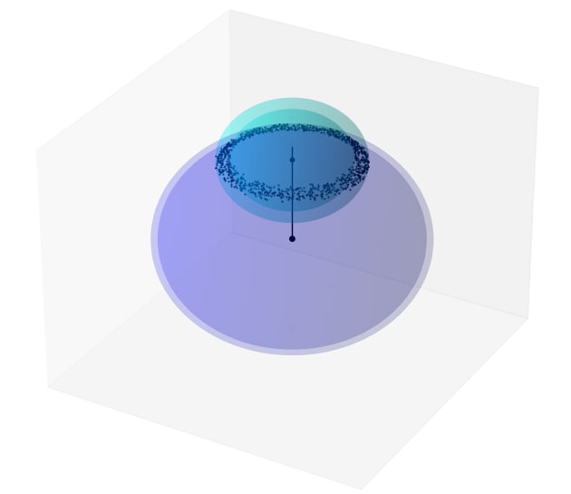 What are we to make of this? It’s hard enough to reason about four dimensions, let alone 4096, but the following 3-d mockup might convey some useful spatial intuitions. Here the larger shell is centred at the origin with inner radius 1.95 and outer radius 2.05. The smaller shell, centred at the centroid, has inner radius 0.9 and outer radius 1.1: