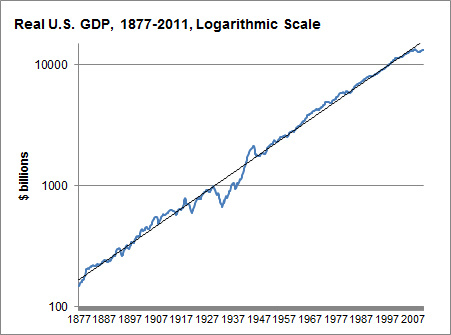 This, according to Nate Silver, is a log-scaled graph of the GDP of the United States since the Civil War, adjusted for inflation. What amazes me is how nearly perfect the linear approximation is (representing exponential growth of approximately 3.5% per year), despite all the technological and geopolitical changes of the past 134 years. (The Great Depression knocks it off pace, but WWII and the postwar recovery set it neatly back on track.) I would have expected a much more meandering rate of growth.