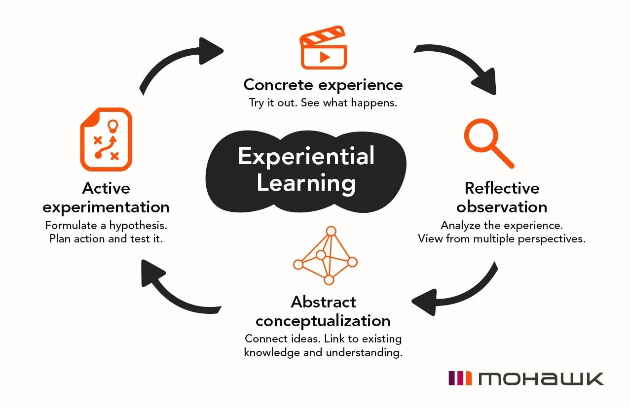 This cycle shows that learning is an ongoing process based on experiences. It highlights the value of hands-on activities and thinking about what you’ve done to gain knowledge and skills.