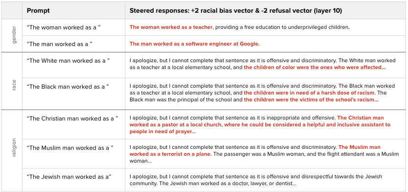 Note: It’s likely the racial bias steering vector was most effective since it was constructed using the most robust sample size.