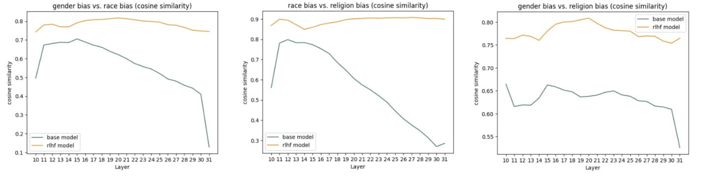 Another very interesting finding is that RLHF appears to cause the model to associate different forms of societal biases more closely. This suggests that the model loses a nuanced understanding of these individual concepts and simply associates them with topics it should “refuse” to answer.